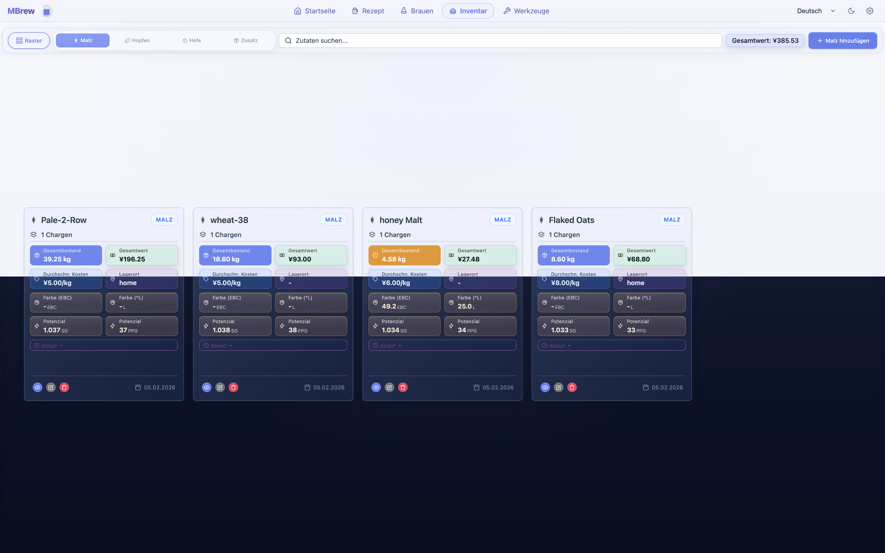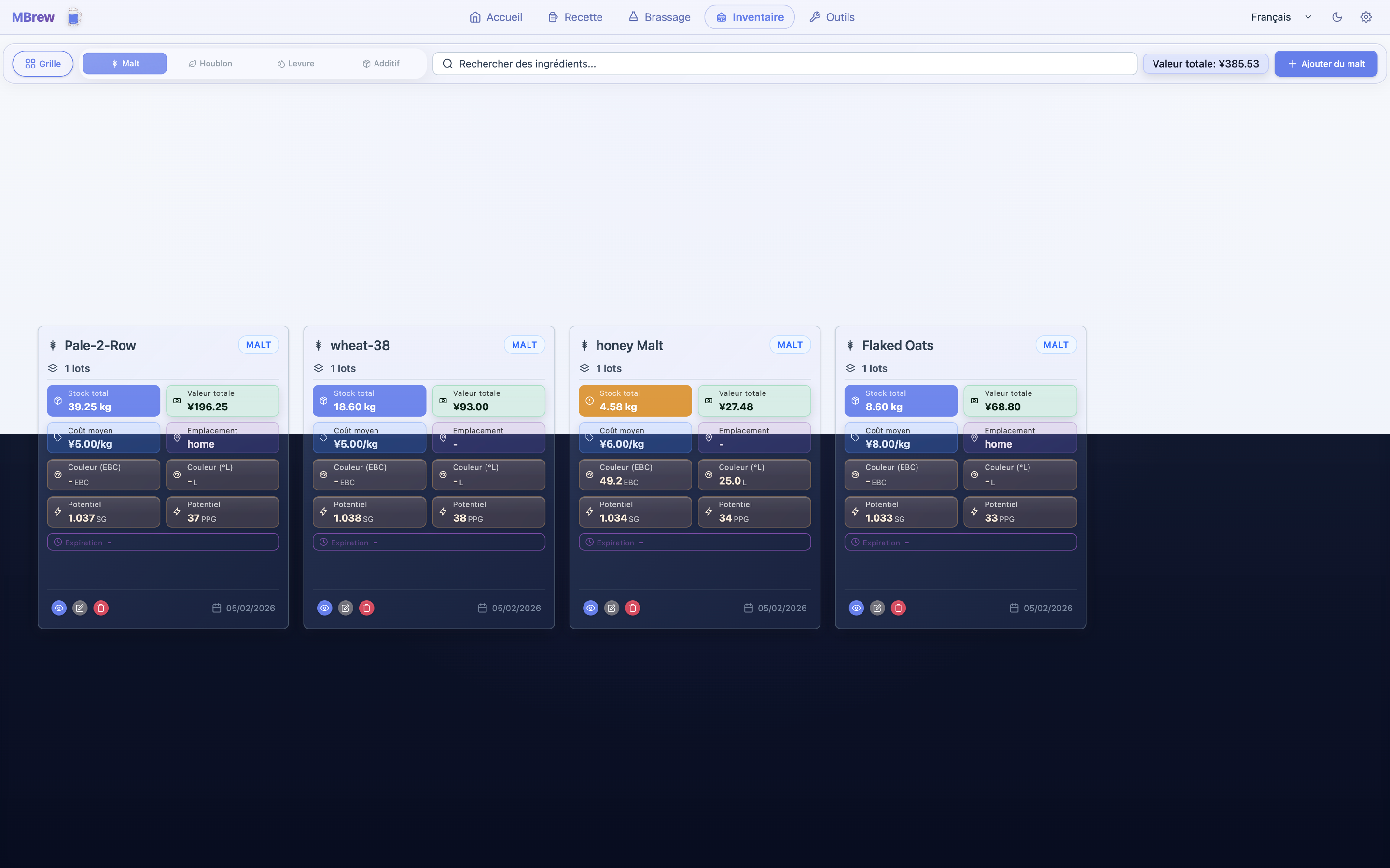 - Ingredient library and inventory for fermentables, hops, yeast, and misc additions (custom items supported)