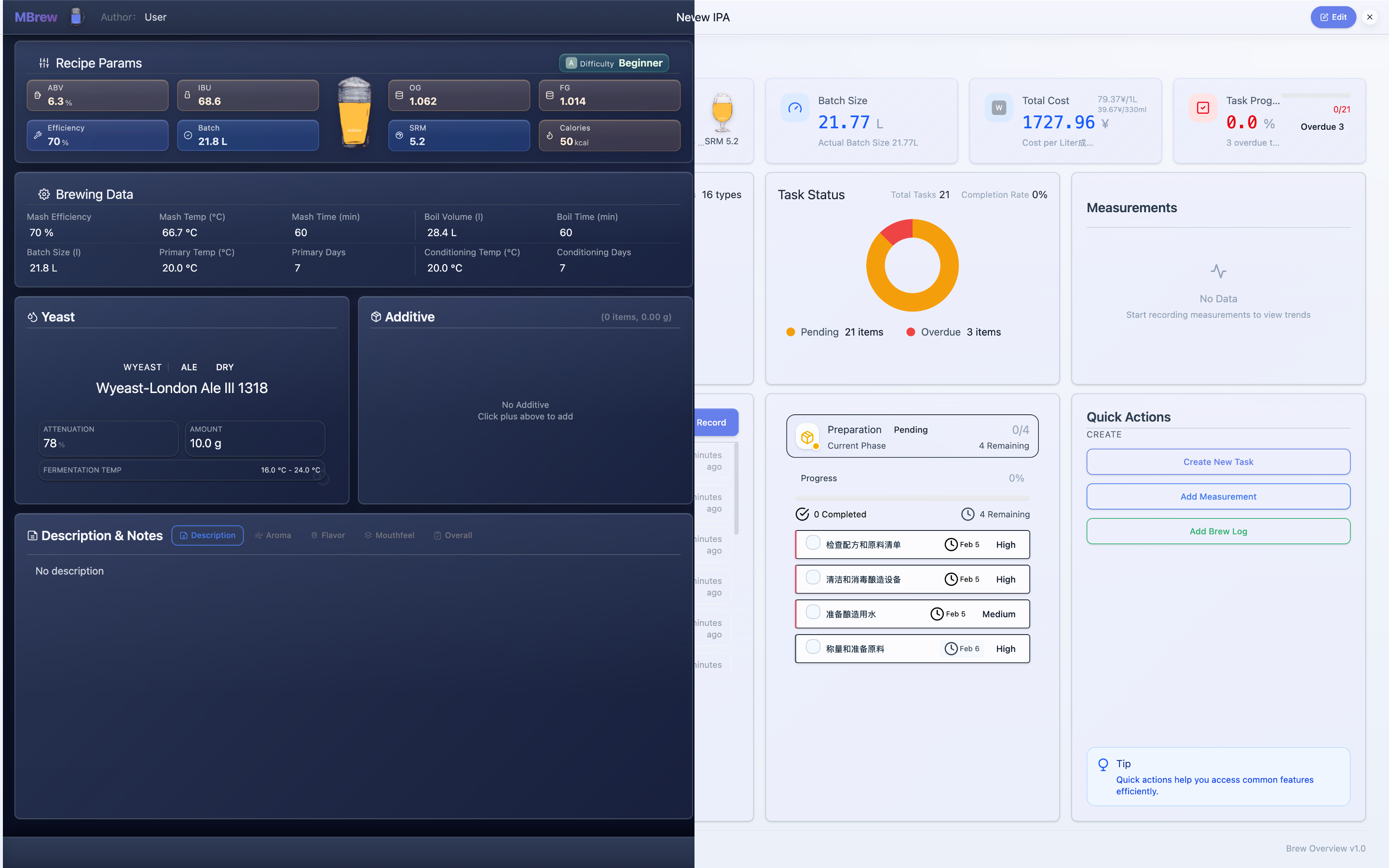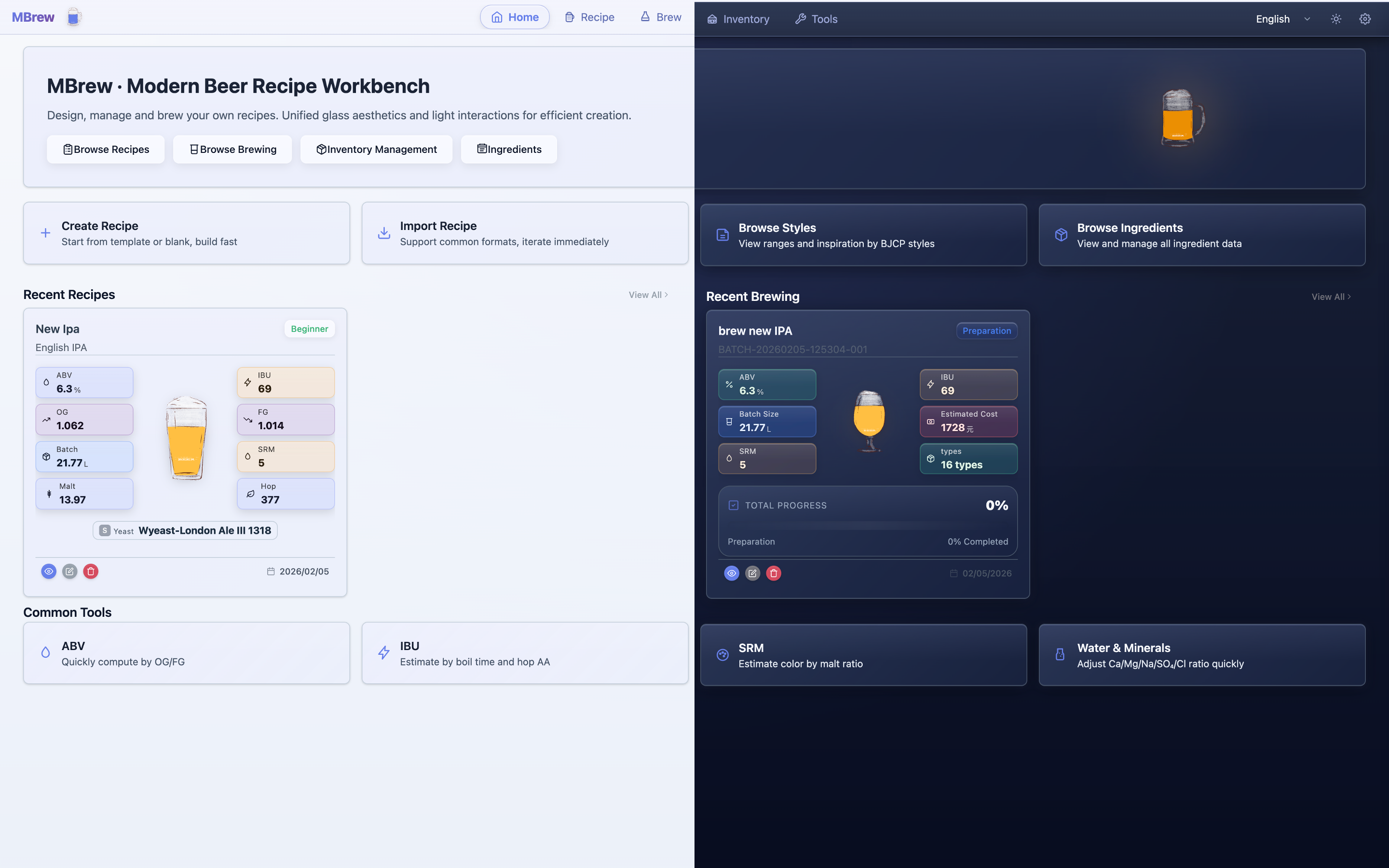 MBrew is a local-first brewing companion for craft beer enthusiasts and professional brewers. It combines recipe design, key brewing calculations, end-to-end batch tracking, and visual analytics into one workflow so you can reliably hit your target profile and reproduce your best batches.