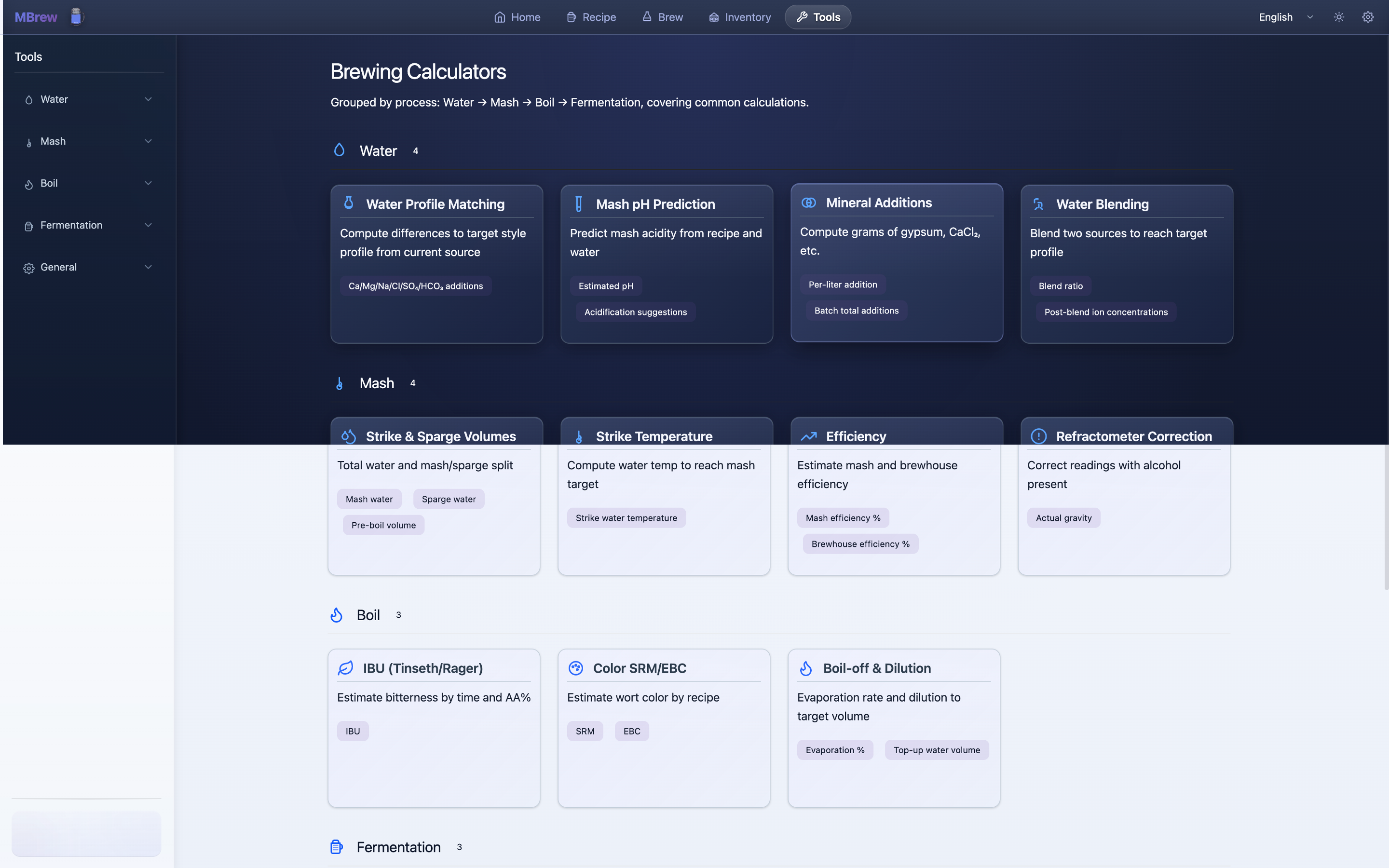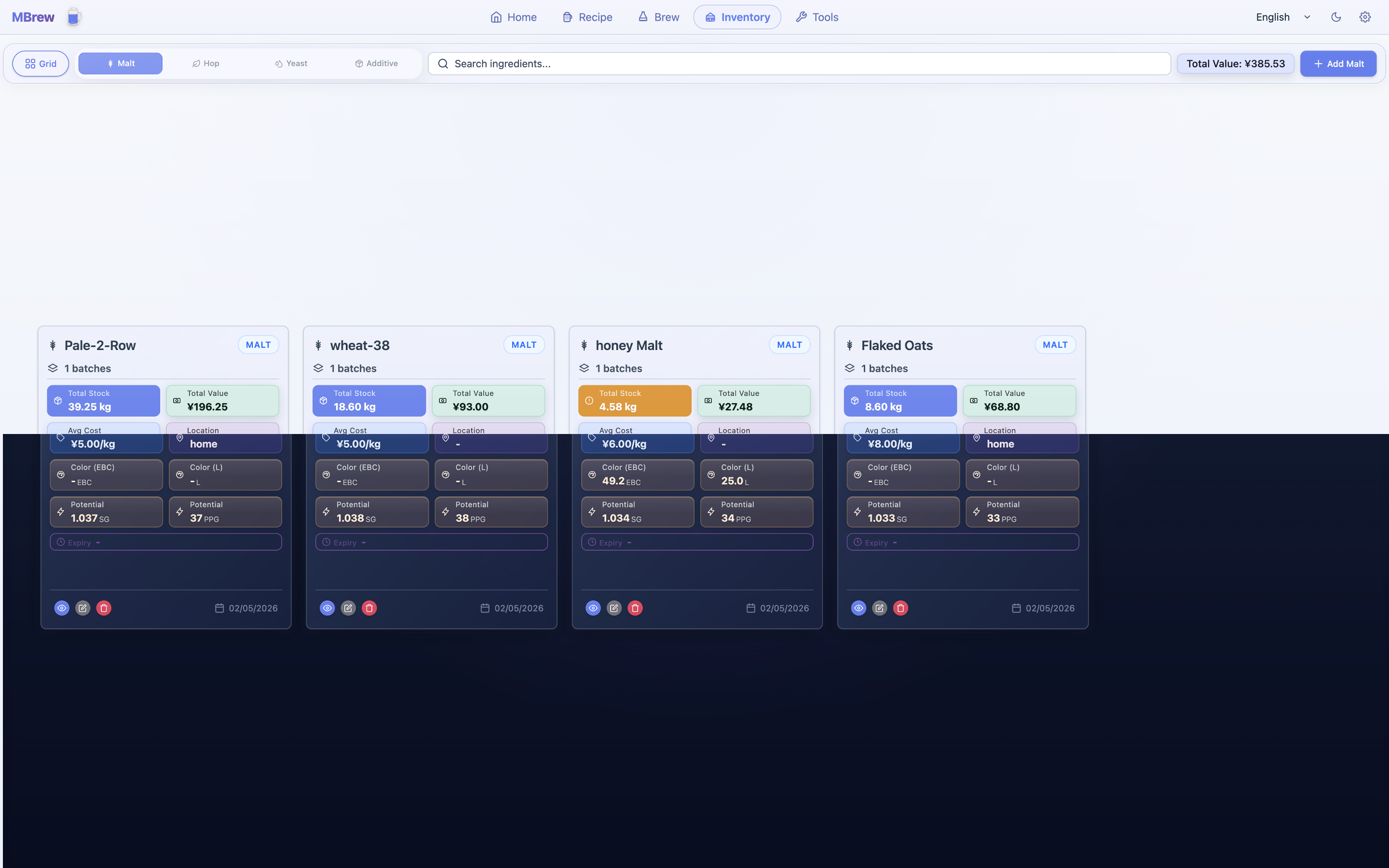 - Ingredient library and inventory for fermentables, hops, yeast, and misc additions (custom items supported)